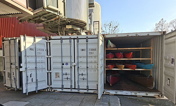 Während dem Clubhaus-Neubau können wir vor dem dunklen Hochhaus beim Verkehrshaus drei Schiffscontainer nutzen, wo unsere Offene Ausleihe (Clubboote) und ein paar private Boote lagern. Zudem haben wir Räumlichkeiten im Erdgeschoss und im Keller zur Verfügung.